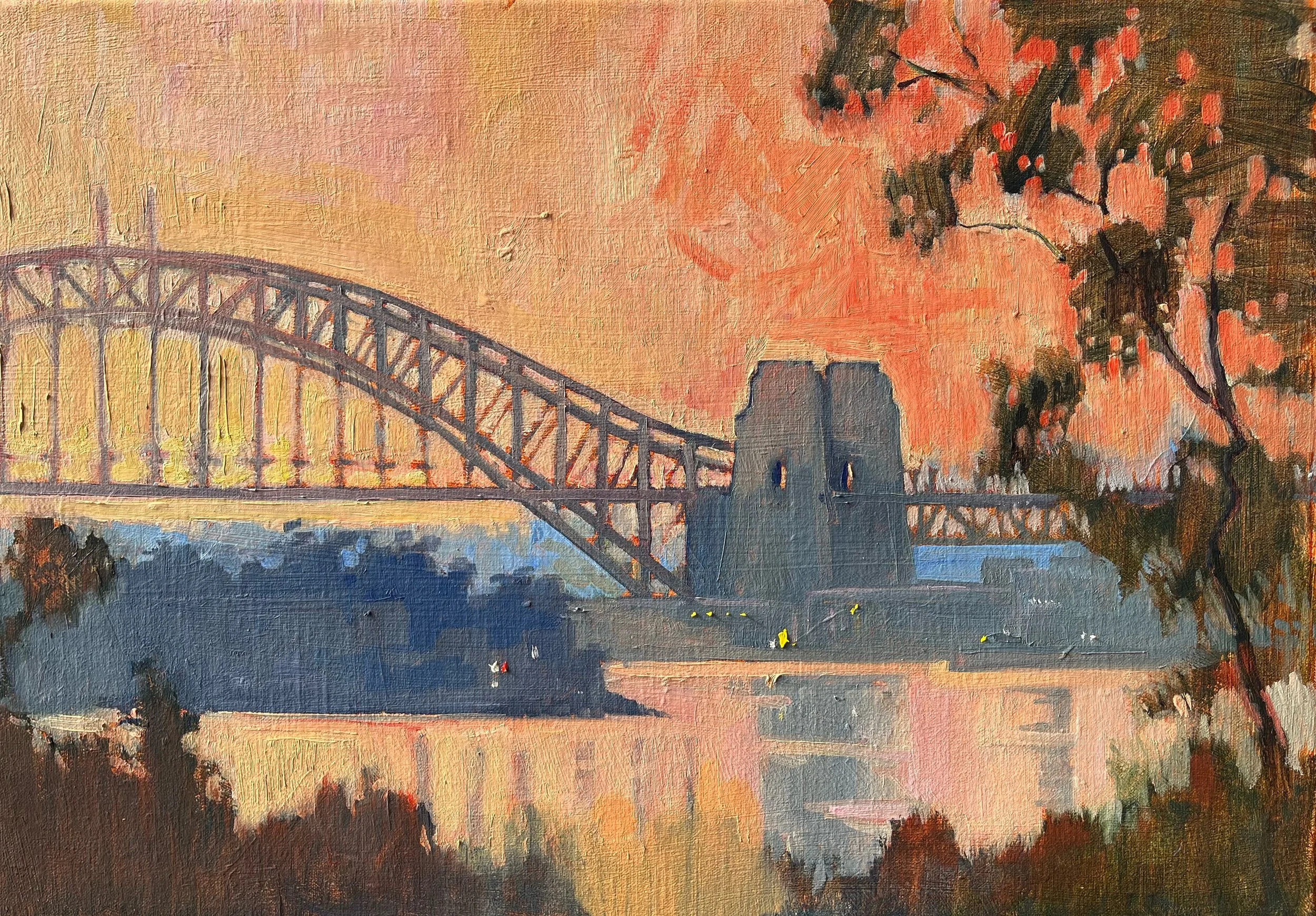 Across to the three sisters -Blue Mountains (unframed) $615.00 Sacred Mountain: Nunguu Mirral (unframed) $700.00 Mangrove River Dawn (unframed) $700.00 King Billy Lynch Hill (framed) $830.00 Across the water : Cockatoo Island (framed) $990.00 Winter Road, (framed) $990.00 Harbour Bridge from Observatory Hill (framed) $710.00 Across Balmain to the bridge (unframed) $710.00 Sunrise, Sydney Harbour (framed) $1,100.00